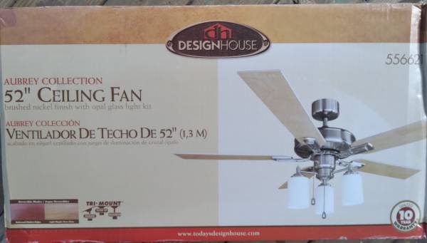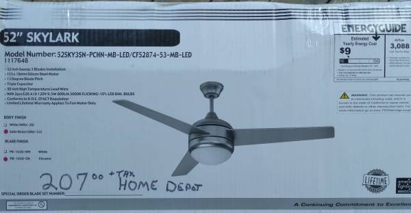 Brand new in the box Skylark 52" 3 blade ceiling in modern brushed nickel blades and housing. Also has led light kit and installation instructions. $130. Sells for $207 + tax at H.Depot.
