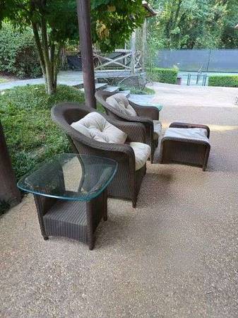 Pair of Lloyd Flanders Wicker Lounge Chairs, Ottoman & Table