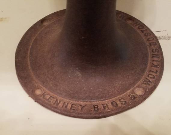A rare vintage antique elementary school Desk and Chair set from Kenney Bros & Wolkins of Boston, MA with adjustable castings/legs from 1900s. Seat and Desk can be adjusted. Solid wood desk and chair with cast iron adjustable legs. Seat features bent wood rungs. KENNEY BROS & WOLKINS, BOSTON MASS." cast on both desk leg base and chair base. Desk measures 21" x 13" x 24 - 30"T. Chair measures 14" x 13" x 11" - 20"T. Wooden desktop and seat. Cast iron decorative legs and base. Desk top shows it's age while the iron has no cracks or broken off pieces. Some age appropriate wear, as is condition.