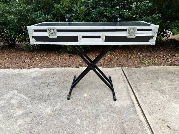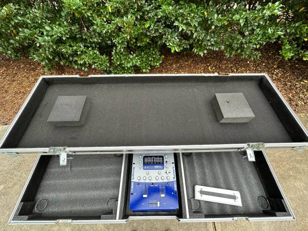 Odyssey DJ coffin. Road hard case with latches. Fits 2 turntables (standard and NOT battle style) and mixer in the middle (MIXER NOT INCLUDED). Full carpet and padding all around the inside. QuikLok stand. I believe it is supposed to be for keyboards, but i used the bottom for the coffin and the top to hold the lid when in use.