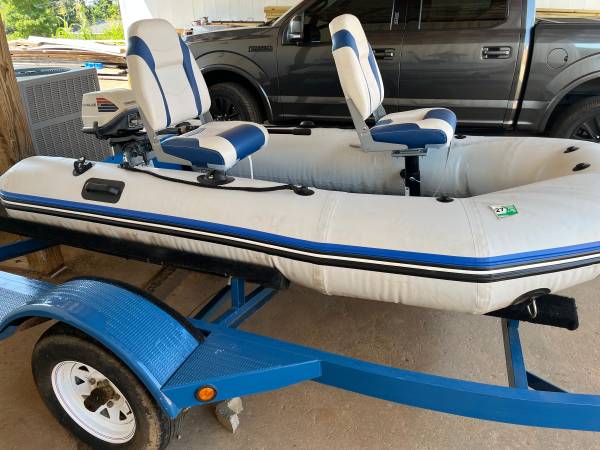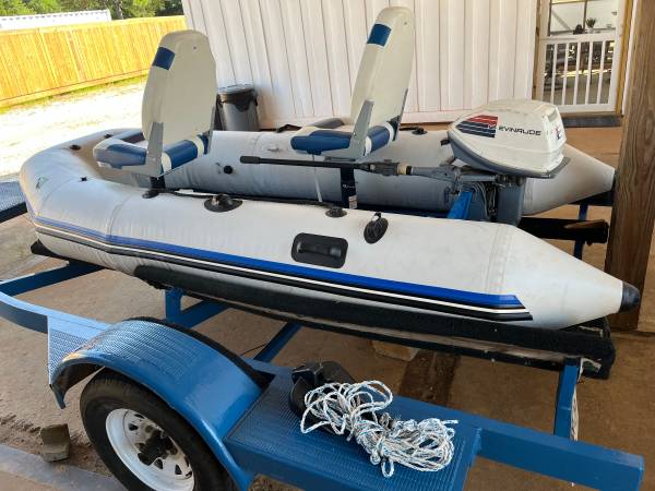 6HP Evinrude with 40lbs thrust trolling motor, recent tune up on motor, brand new battery (Interstate Marine/RV Deep Cycle), Fully equiped and ready to go fishing! Brand new fuel tank and fuel lines (6 gal), oars, rope and anchor, new tires and paint job on trailer!