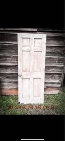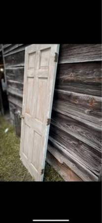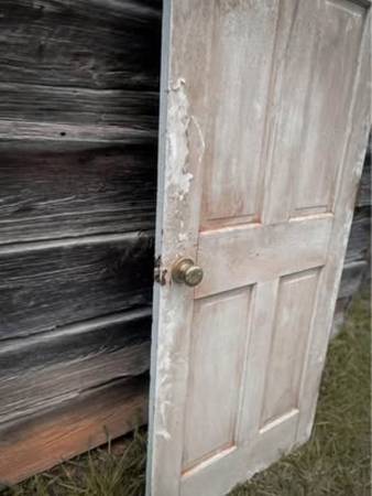 Beautiful old solid wood door with great vintage character. Features its original knob and distressed white paint with natural wear that gives it an authentic farmhouse look. Perfect for restoration, repurposing, or use as décor — think sliding barn door, pantry, or headboard project.