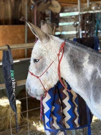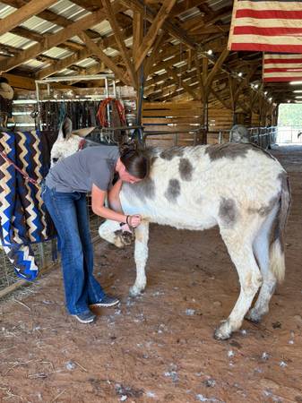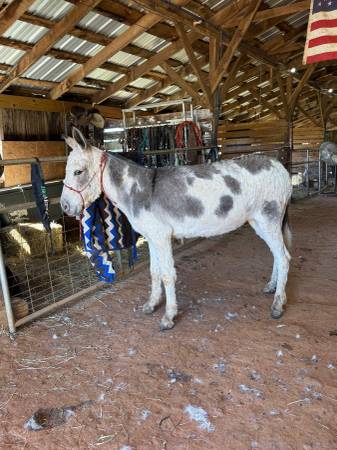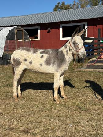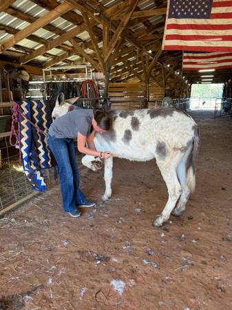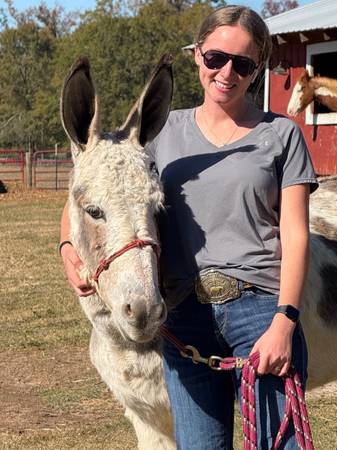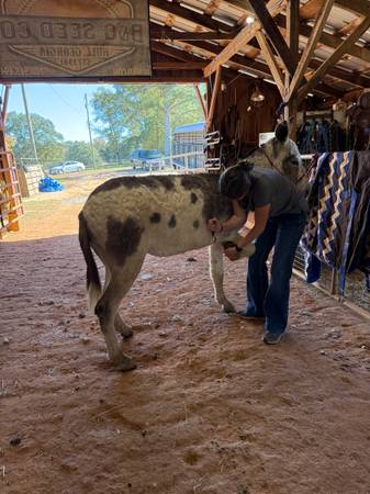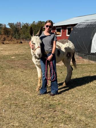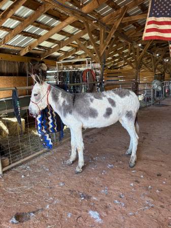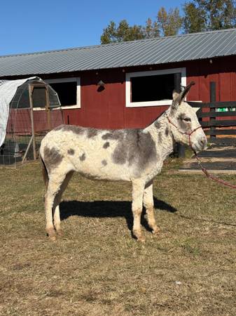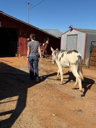 Fern is a super sweet 5 year old spotted Jenny Donkey. Fern is halter broke and very easy to handle. This sweet girl will lead, load, tie, pick up all her feet, is easy to catch and good for the farrier. Fern has been excellent with everything she has been turned out with and loves attention. Fern is a sweet donkey that could make someone an excellent pet, mama, guardian, companion or even a riding or driving prospect. Fern is ready for her new home now.