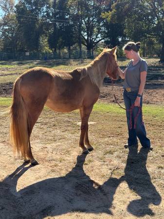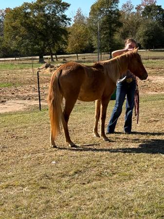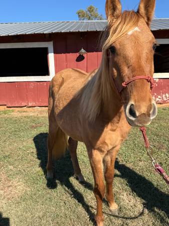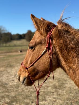 Matilda is a 2 year old filly that will mature to a large to medium Quarter type pony. Matilda would be a great addition to a lesson barn looking for something gentle for kids to bring along. Matilda has had all the ground work done and is ready to pick a career and begin very lightly this sweet girl would be a heck of a Christmas present or a great spring project. Matilda picks up all four feet, loads, leads, lounges and loves attention. Matilda is up to date on coggins, vaccines and deworming. Make this sweet girl a part of your kids life and they can grow together or put her in a little hunter barn and she will thrive she has extremely floaty movement and has the beautiful sun color on top of it! Ones like this girl are hard to find already gentle and ready to go in whatever direction you choose.