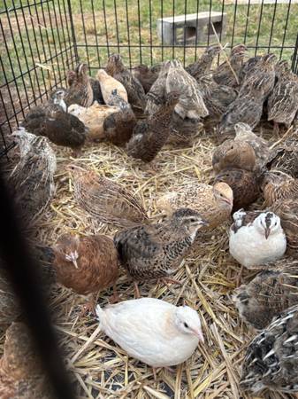 $6 each or $5 each if you buy all 7 wk old Cutornix quails ONLY MALES! Minimum of 5 Ready to go in the freezer!