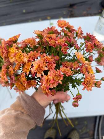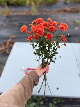 Freshly cut Kelvin mandarin heirloom mum flower stems! $2 per stem! Smaller stems are $1. Each stem has multiple blooms. Long vase life and long stems. Other colors available. Organic practices so...