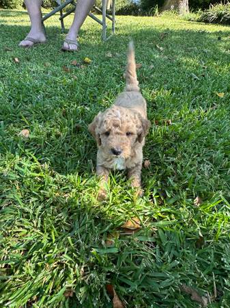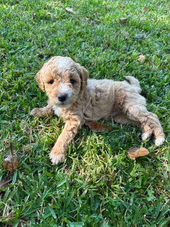 Miniature Goldendoodle puppies. Very sweet and loving. 8 weeks old and up to date on shots. Available for pick up October 4th Asking a rehoming fee.