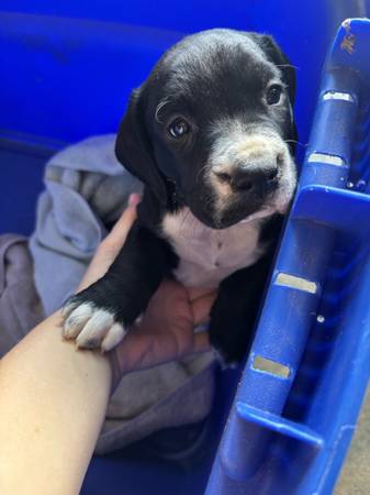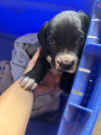 Rehoming 6 week old puppy. Shots and dewormed. Comes with food and a few things. Black lab and bulldog mix