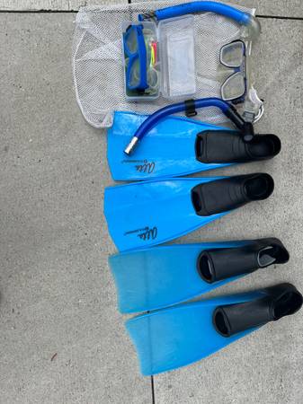 US DIVERS snorkeling set, adult men and womens Cabo Tempered Mask and Alta fins, Fins are 20" x 7", storage bag $40 total for both sets. used a couple times at best