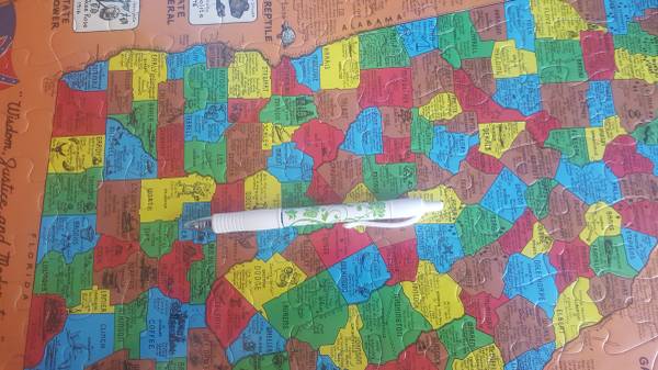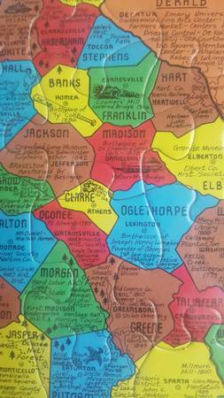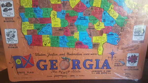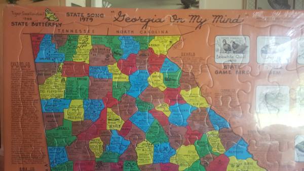 Cash only, porch pickup. No calls or texts. So check your email for my reply. Georgia jig-saw puzzle, in plastic. From 1990 -- see pics. I think about 20" x 16", will double check. Non smoking home.