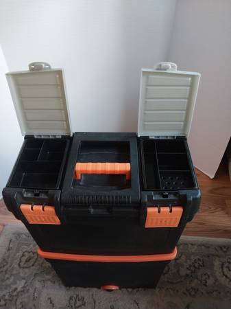 No calls or texts, so check your email for my reply. Cash only, porch pickup. East side Athens. Kid sized Black & Decker play tool box, on wheels. Empty