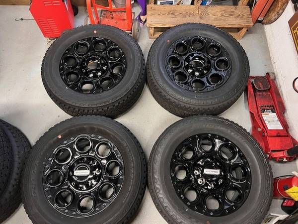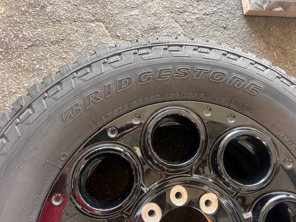 Set of four 20" BLACK Ford F-250 F-350 Single rear wheel SRW factory OEM takeoff wheels with Bridgestone A/T tires with Black Center Caps in Ford Packaging.